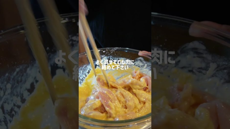 ③ パン粉と片栗粉を混ぜて衣を作り、(②)の鶏むね肉にまぶす。