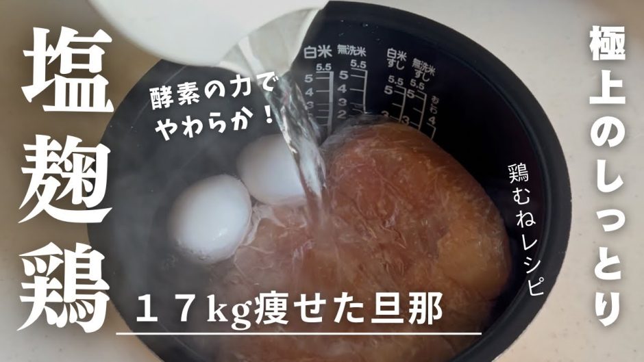 塩麹と炊飯器の低温調理で鶏むね肉がしっとり肉に変わるレシピ。下準備では、包丁もまな板も使わない、炊飯器に入れておけば出来あがる簡単な作り方です。