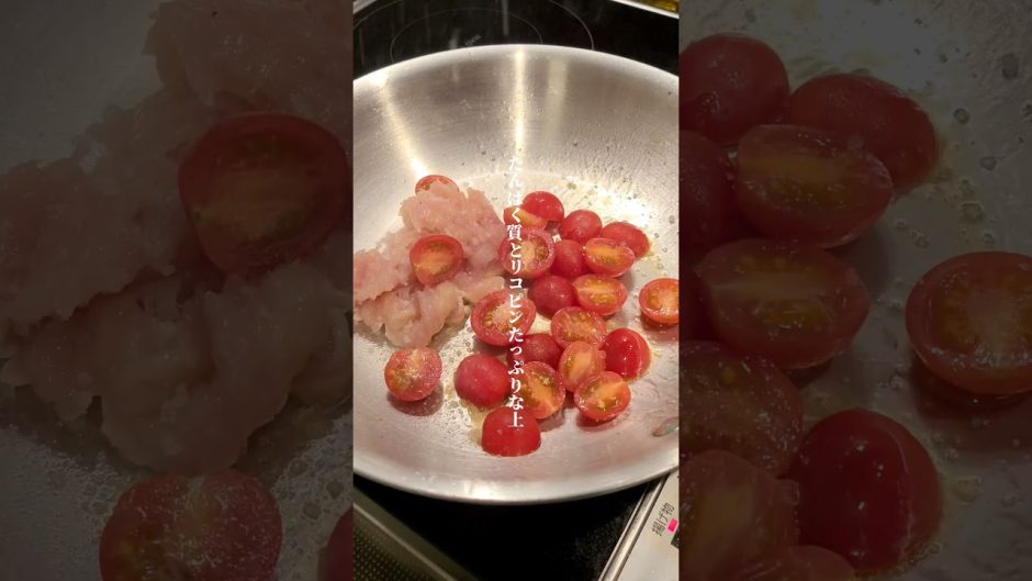 1.フライパンにオリーブオイル、とりむね肉、トマトを入れて炒める